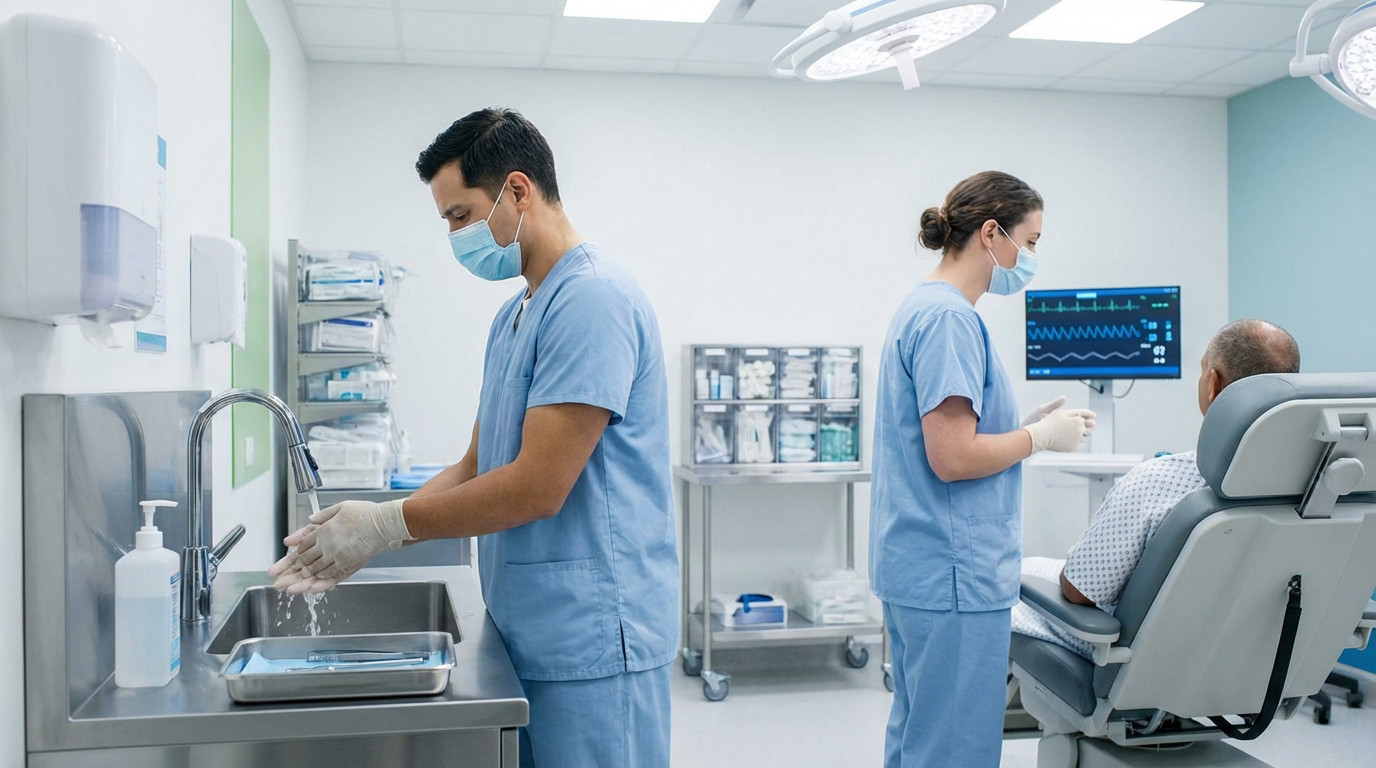 La rapidité de l’ambulatoire n’excuse aucun laxisme. L’hygiène des mains, le port des tenues et la discipline de circulation sur le plateau technique sont cruciaux pour la sécurité du patient.